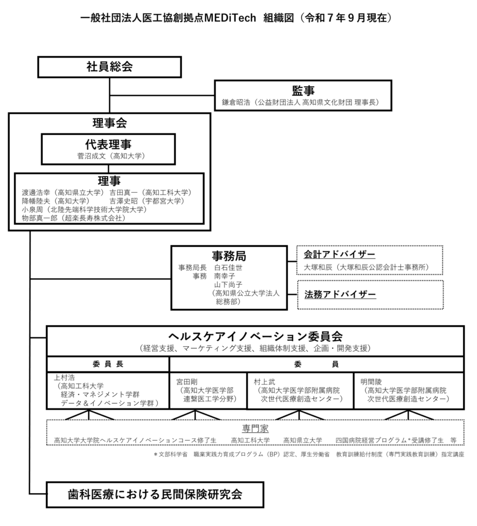 一般社団法人 医工協創拠点MEDiTechは、医療やその周辺を含めたヘルスケアとテクノロジーの連携研究によって生まれる新たな健康医療の解決策を、伴走によって早期に実現するための専門家集団です。医学、工学、経営学、さらには、臨床研究、規制科学など特に新たな医療を生み出すために必要な専門的な支援体制を準備しています。
